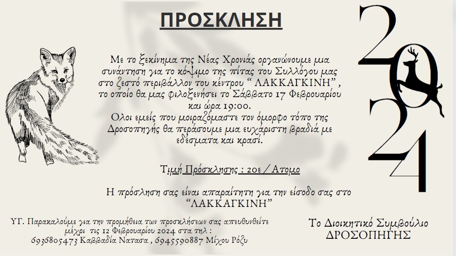 το Δ.Σ του Συλλόγου μας , σας ευχαριστεί για την τόσο μεγάλη προσέλευση σας στο κόψιμο της πίτας μας, η οποία μας συγκίνησε και μας ενθάρρυνε ταυτόχρονα, διότι με αυτόν τον τρόπο δηλώσατε έμμεσα,την καλή σας διάθεση για συμμετοχή στην κοινή προσπάθεια να κρατήσουμε τον Σύλλογο ενεργό με δυναμική παρουσία στα κοινά. Ευχαριστούμε επίσης τον Αντιδήμαρχο Αφιδνών κο Γ. Βλάχο, τον Αντιδήμαρχο Πολιτικής Προστασίας κο Γ.Δήμα, τον Πρ'οεδρο της κοινότητας Αφιδνών κο Δ.Πάντο και τον Πρόεδρο Εκπαιδευτικού τομέα κο Γ.Ντόστη. Επίσης δεν θα παραλείψουμε να ευχαριστήσουμε τον Βουλευτή της περιοχής μας κο Β.Οικονόμου και τον πρώην Ευρωβουλευτή κο Ν.Μαριά , οι οποίοι παρέστησαν επίσης στην όμορφη ατμόσφαιρα του Λακκαγκίνη που χάρισε σε όλους μας μια ανεπανάληπτη βραδιά.
